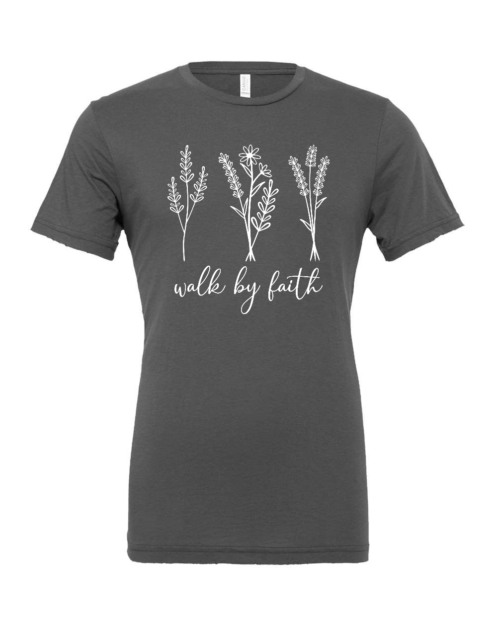 Step forward with grace and confidence in our "Walk by Faith" custom T-shirt, featuring the inspiring phrase "Walk by Faith" beautifully displayed alongside three delicate floral bouquets. This design perfectly blends a message of spiritual strength with the beauty of nature, creating a T-shirt that is both uplifting and stylish. The words "Walk by Faith" are elegantly printed in a graceful, flowing script, symbolizing the journey of trusting in something greater. The three floral bouquets, arranged across the front, add a touch of natural beauty and femininity, representing growth, renewal, and the blossoming of faith. The combination of the inspirational message and floral design makes this T-shirt a versatile piece that can be worn for any occasion, from casual outings to moments of reflection. Crafted from soft, high-quality cotton, this T-shirt offers comfort and durability, ensuring it will be a favorite in your wardrobe. Available in a range of colors and sizes, the "Walk by Faith" T-shirt is perfect for anyone who cherishes their faith and appreciates the beauty of nature. It also makes a thoughtful gift for friends or family members who embody the spirit of walking by faith.